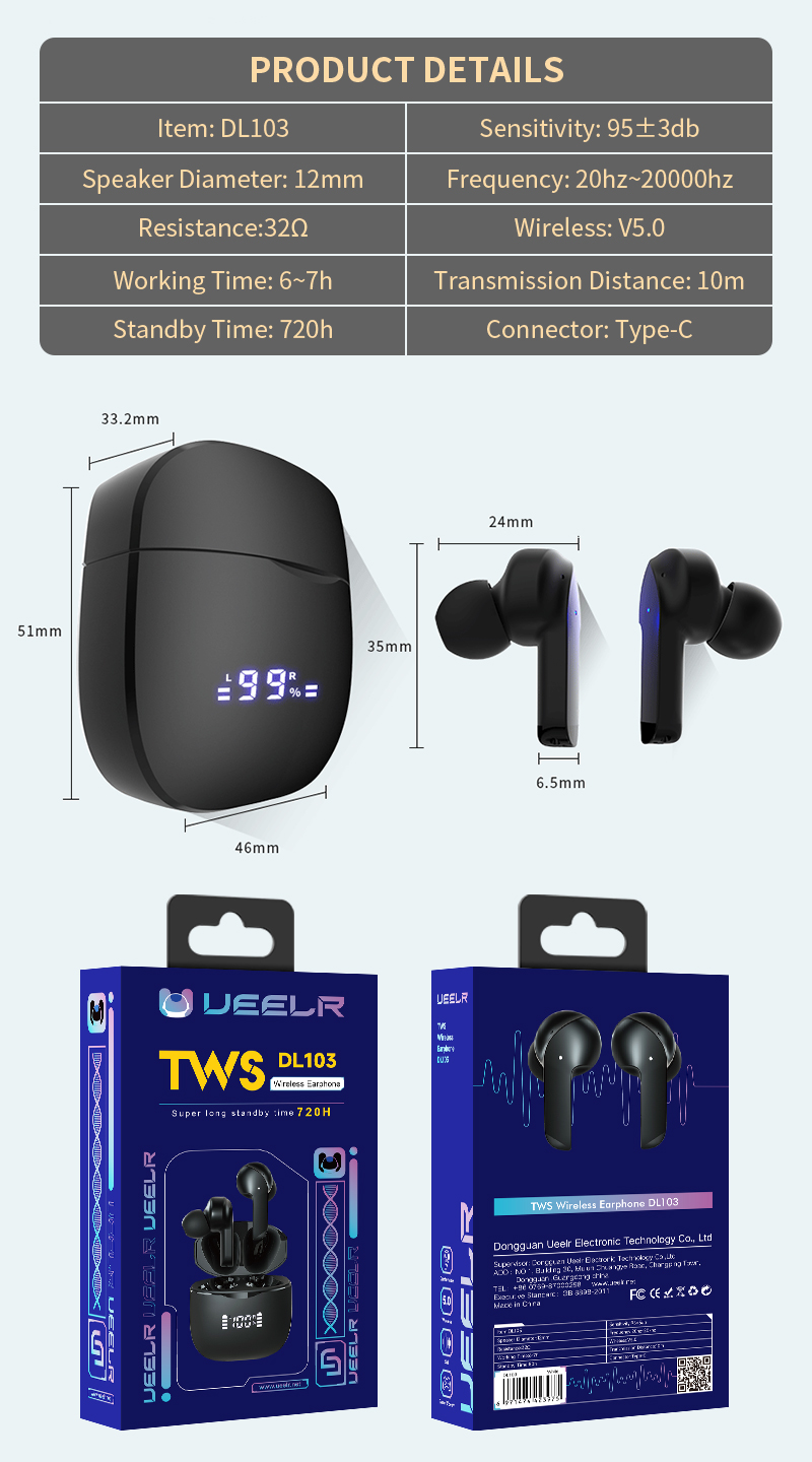 DL103-1TWS bluetooth headset waterproof and sweatproof digital display 30 hours battery life